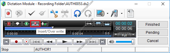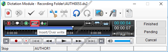 • Gerekli modu seçmek için “INSERT / OVER” düğmesine basın. Dikte ek kayıtlar eklemek için, ek simgesinin gösterildiğinden emin olun.